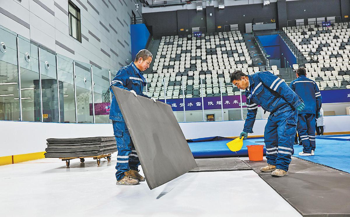 走进榆林科创新城乙级滑冰馆,工作人员正紧锣密鼓开展设备调试与场地运维。馆内标准冰面平整光亮,3000个观众席及记分牌、照明等设施全部就位。这座总占地9400余平方米的场馆,将承接省一冬会冰球、冰壶等核心赛事。
