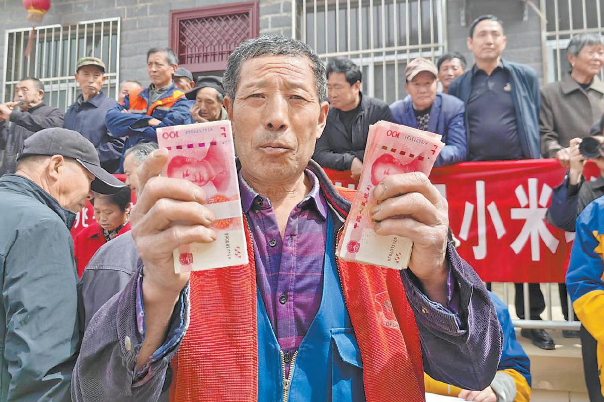 村民手握销售自家小米所得现金。